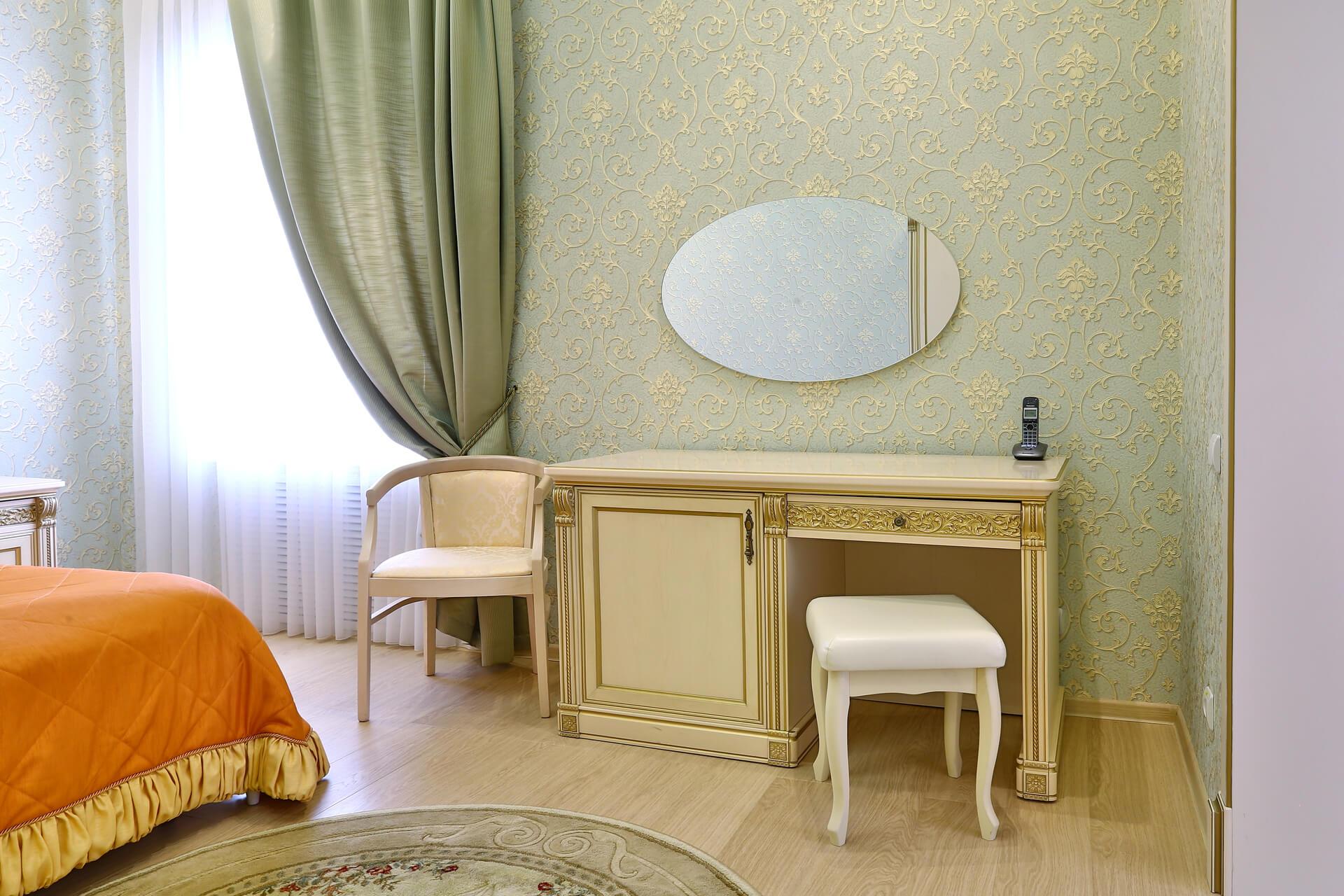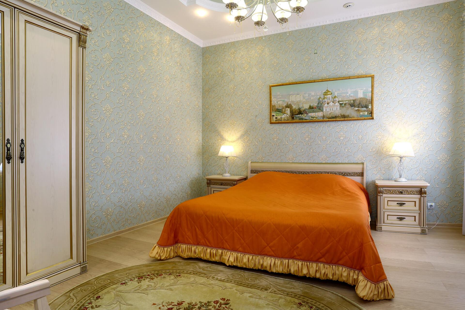 Просторный двухкомнатный номер 73,25 кв.м. с гостиной (диван, кресла, стол, шкаф с набором посуды) и спальней с широкой кроватью.