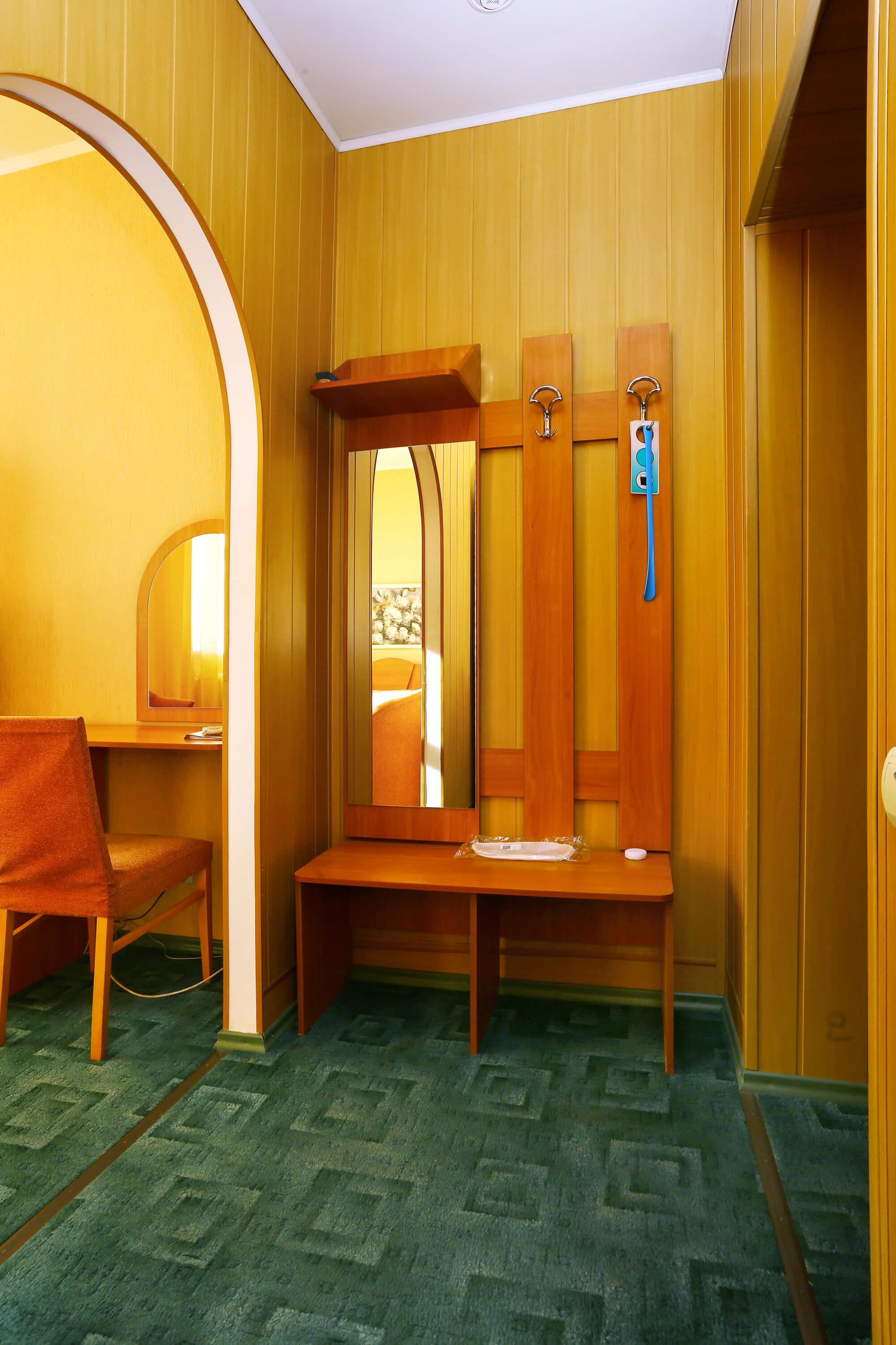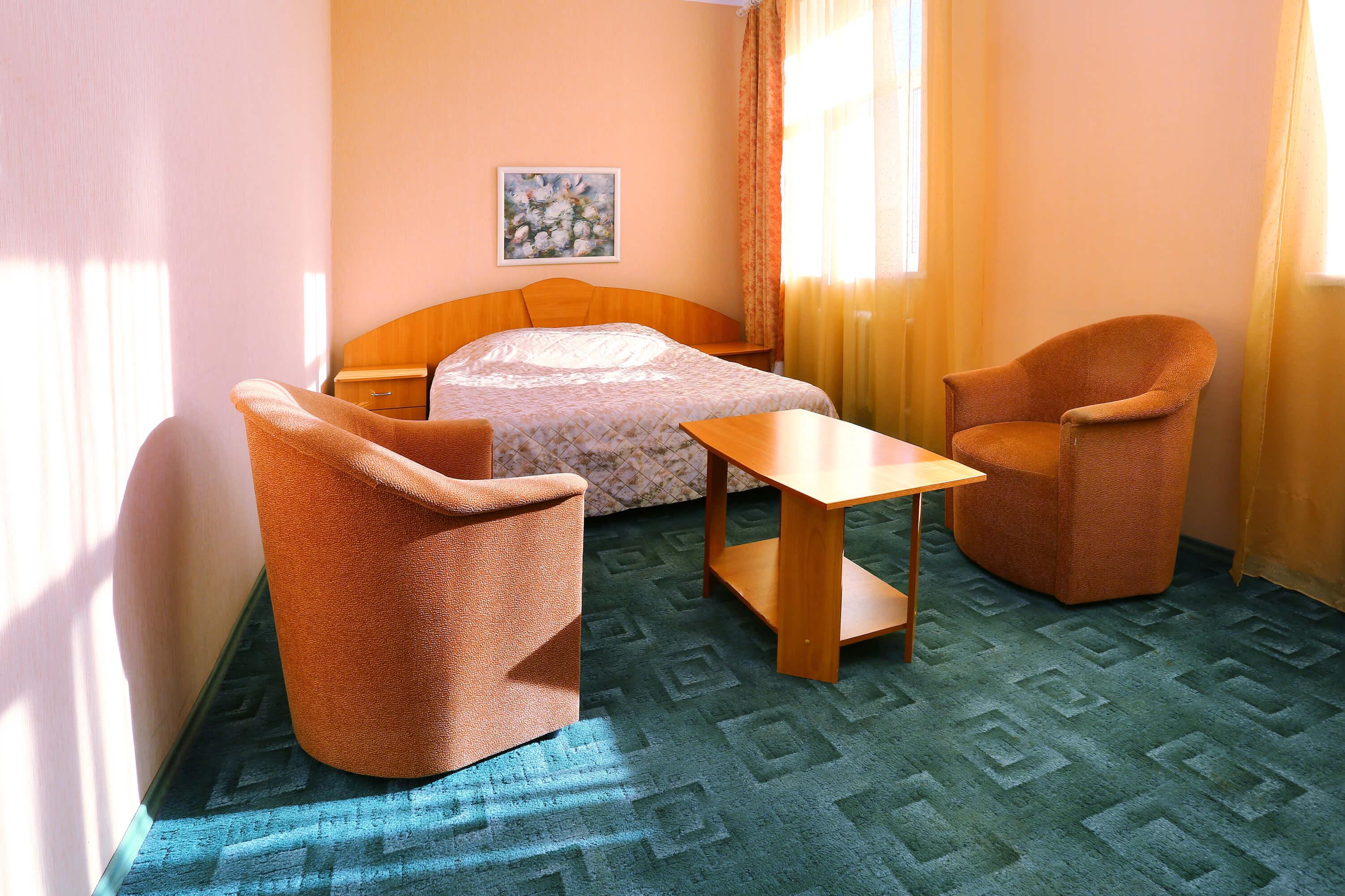 Номер площадью 17 кв.м. с одной широкой кроватью. Состоит из жилой комнаты, поделенной на две зоны: спальную и рабочую.