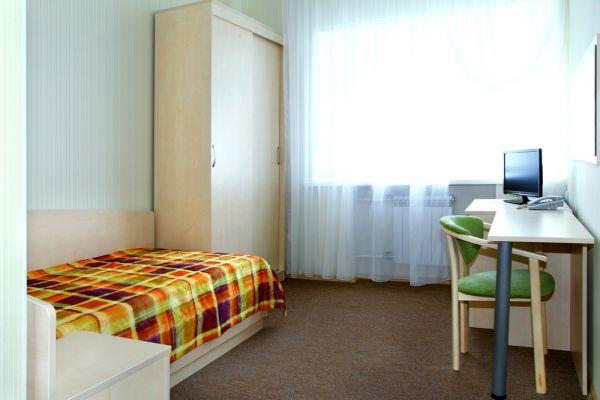 Номер площадью 13,5 кв.м. с одной кроватью. Состоит из жилой комнаты, поделенной на две зоны: спальную и рабочую. Рассчитан на проживание одного человека.