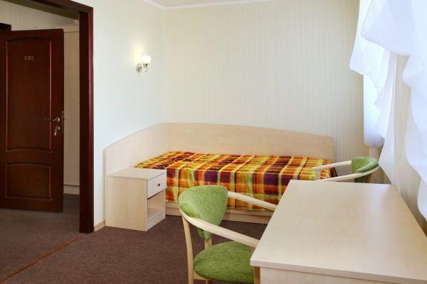 Номер площадью 9,6 кв.м. с одной кроватью. Состоит из жилой комнаты, поделенной на две зоны: спальную и рабочую. Рассчитан на проживание одного человека.